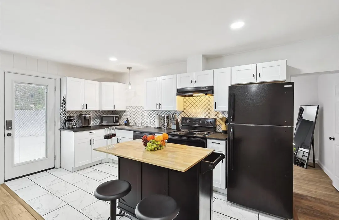 Delightful 1Br 1Ba Cozy Flat Apartment comes with a kitchen where guests can cook their own meals.
